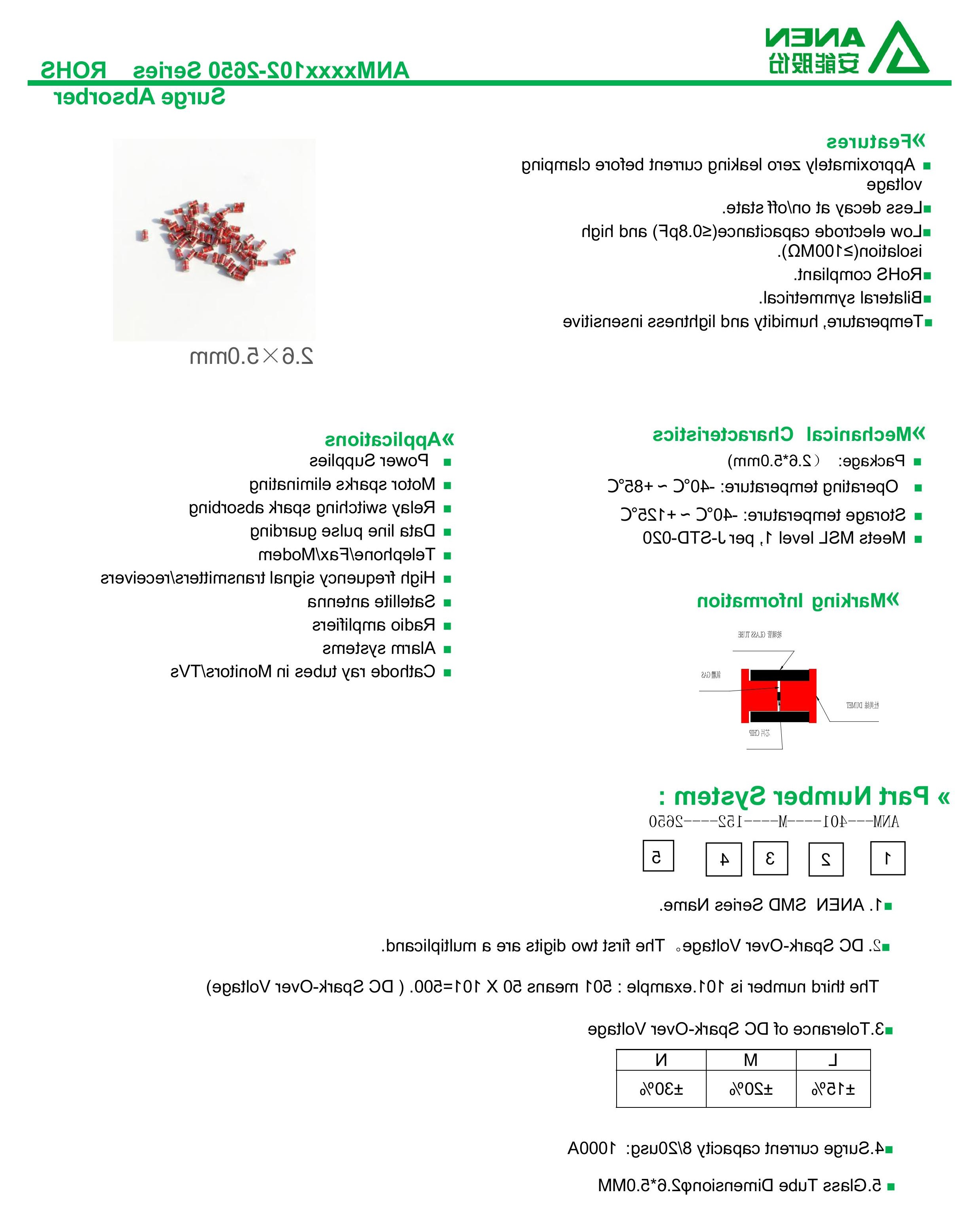 玻璃气体放电管,它兼有陶瓷气体放电管和半导体过压保护器的优点:绝缘电阻高(≥10^8Ω)、极间电容小(≤0.8pF)、放电电流较大(最大达3kA)、双向对称性、反应速度快(不存在衝击击穿的滞后现象)、性能稳定可靠、导通后电压较低,此外还有直流击穿电压高(最高达5000V)、体积小、寿命长等优点。